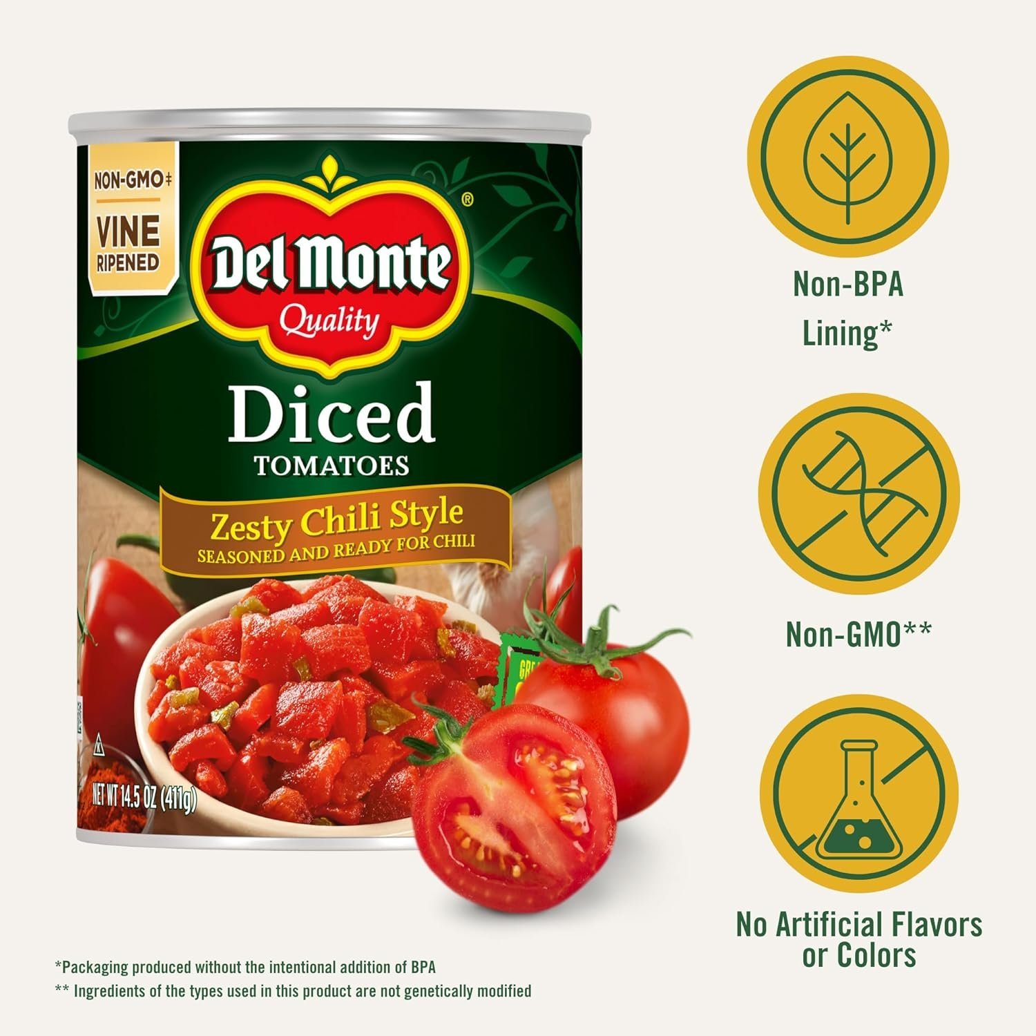 • NO ARTIFICIAL FLAVORS: These non-GMO canned tomatoes are perfect for elevating any hearty chili or mouthwatering queso. Del Monte Canned Zesty Chili Style Diced Tomatoes elevate your cooking with a burst of rich, spicy goodness.