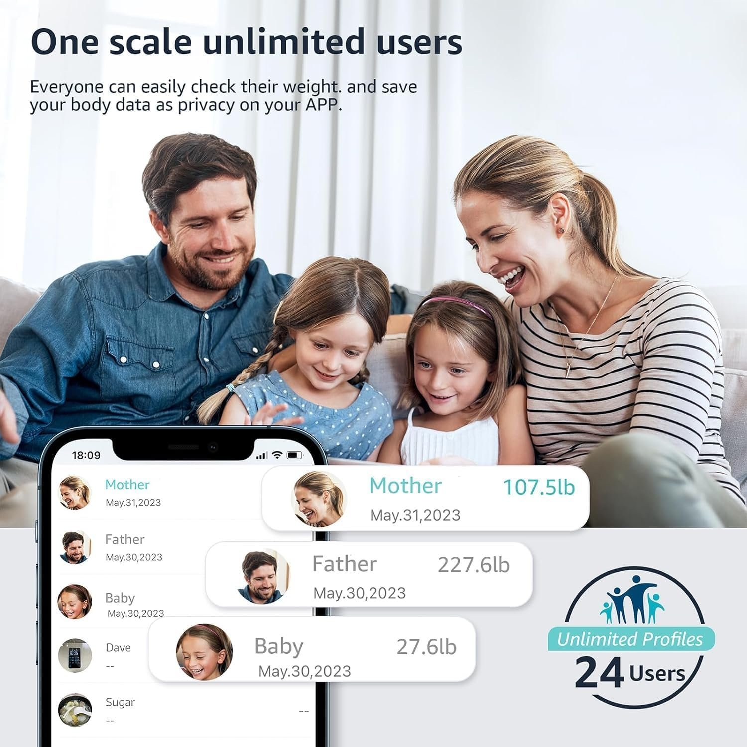 - Sync with Health Apps – FITDAYS app on IOS and Android, and FITDAYS app can easily sync with other fitness Apps like Apple Health, Google Fit, Samsung Health, Fitbit and so on, which let you store and share your data more conveniently. Fitdays App allows you to create unlimited profiles 24 Users for your family and friends with only one smart scale. It is very helpful and convenient for those who keep fit and do health sports for improvement goal.